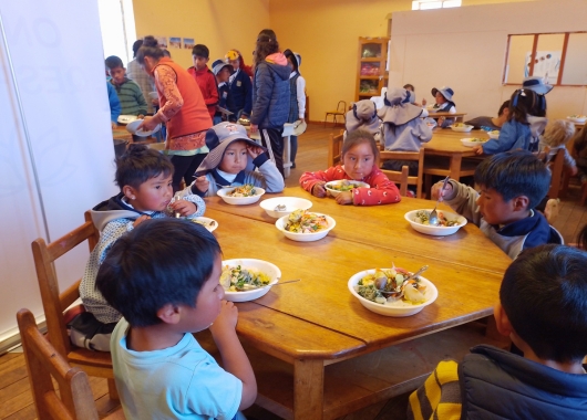 Qespina schult die Lehrenden dazu für einen Unterricht mit Raum für Kreativität und individuelle Förderung. Auch Legenden und Lieder auf Quechua und Spanisch, das Malen, Basteln und Tanzen machen die Kultur und Tradition für die Kinder erfahrbar.Qespina fördert auch das Lernen organischer Anbaupraktiken. Das Schulessen ist für viele Kinder in Peru die einzige Mahlzeit des Tages. Ein staatliches Schulessen-Programm sollte diese Mahlzeit sicherstellen. Doch allein in diesem Jahr haben sich mehr als 300 Kinder landesweit schwere Lebensmittelvergiftungen zugezogen.