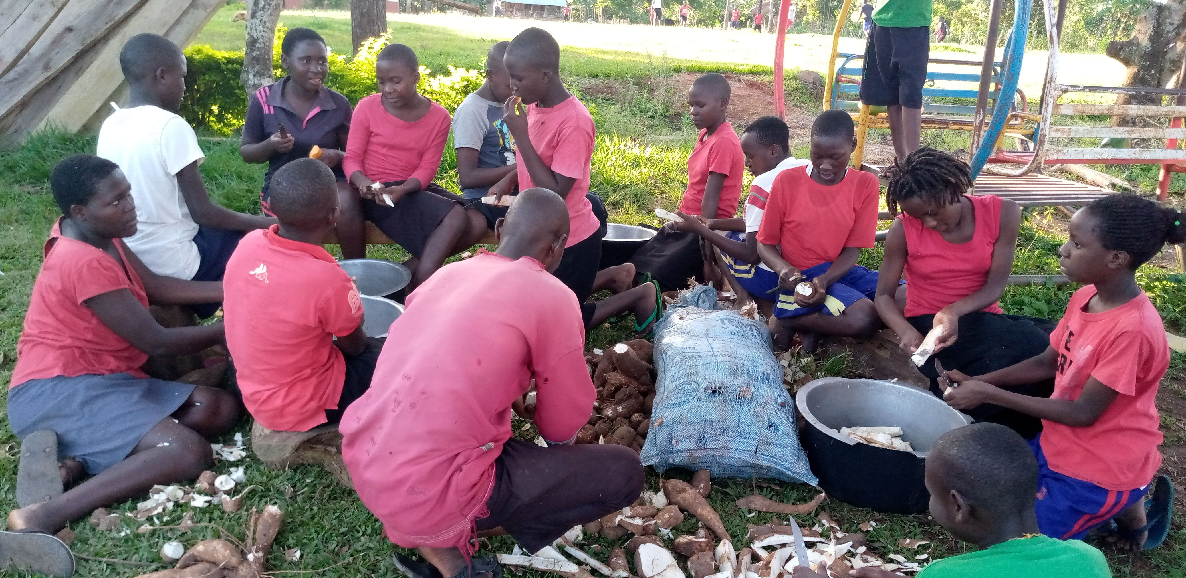 Die Familien der Kinder, die die Kibirige Memorial Primary School besuchen, sind meist kleinbäuerlich. Sie bauen Obst und Gemüse an, manche haben einige wenige Hühner oder Ziegen für den Eigenbedarf. Ihr Einkommen reicht oft nicht aus, um die Schulgebühren für ihre Kinder zu zahlen. Sie können nicht einmal garantieren, dass ihre Kinder etwas zu essen in die Schule mitnehmen. Deshalb bietet die Schule Lehrkräften und Schüler*innen ein ausgewogenes Frühstück an. Gut ernährte Kinder lernen konzentrierter und leichter. Einen Teil dieser Versorgung erwirtschaftet die Schule im schuleigenen Garten. Dort werden Bananen, Kassava, Mais, Bohnen, Kaffee sowie weitere Gemüse und Früchte angebaut.